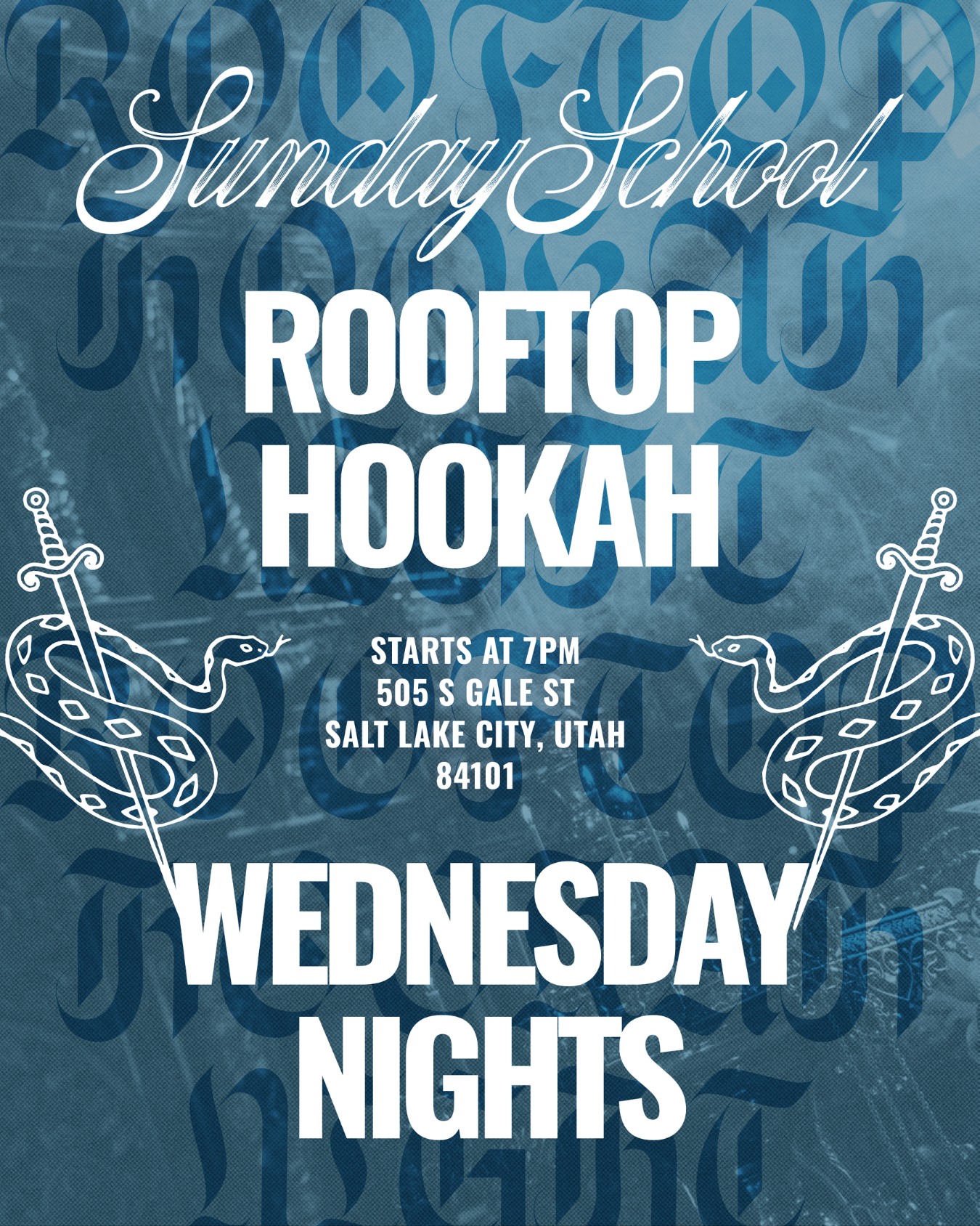Midweek Mood served up right at Sunday School, our new rooftop bar in downtown Salt Lake. Join us on Wednesday Night for the best vibes, city lights and rooftop flavors! Drop in for our Hookah Night starting at 7pm and we're your go to venue for pre and post jazz basketball and hockey home matches. Book your tables asap, hookah tables are first come first serve and in designated compliant tables. 21+ only.